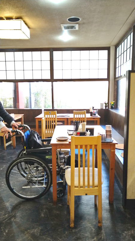 駐車場 全部で11区画あり、うち1区画は幅約290㎝あり、思いやり区画と記されてはいないが、車椅子等対応可能(以前は明示していた)、店の玄関に近いため、普段はコーンが置いてあるが、お客さんが多い昼食時などは開放することがある。 建物入り口 建物は、1階平屋造り。玄関ポーチに庇あり。 建物出入口 自動扉引き戸 幅約120㎝、扉下に1.5㎝段差あるが、マットが敷かれているため段差はほとんど感じられない。 店内 屋内ポーチの後、自動扉で店内へ。すぐに広いフロアーがあり、テーブル席が6席ある。空間は余裕あり、車椅子が十分移動できる。テーブルとイスは移動可能。また、手前左側と奥に座敷席があり、くつろぐこともできる。他にカウンター席もある。 トイレ 店内1つあり、フロアーから続いていて段差なし。男女・車椅子トイレのシンボルマークで提示してあり分かりやすい。98センチ幅引き戸を開けて入ると右奥行95㎝のところに洋式便座が置いてあり、両側に手すりが付いている。洗面から便座までは130㎝と広いため車椅子を置くこともできる。洗面下は車椅子が入りやすいように空間がある。 所見 店は駐車場からほぼ段差なく続いており、店内入ってすぐの広いフロアーでは多人数が楽しめる。すでに車椅子ユーザーさんが利用してみえるということだった。玄関ポーチに段差がある店が多い中、スムーズに気兼ねなく入ることができる店である。 大将さんからは、中心道路に面しているため、駐車場が少ないのが悩みの種だが、手間ひまかけて作ったおいしいうどんをぜひみなさんに食べていただきたいとのこと。 「夢現」の内規に沿って、「優良証」としたい。 |